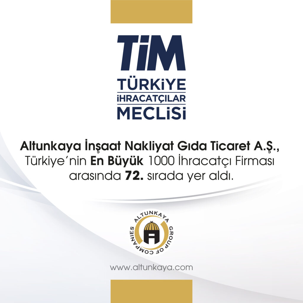 Türkiye İhracatçılar Meclisi (TİM) verilerine göre, Altunkaya İnşaat Nakliyat Gıda Ticaret A.Ş., “Türkiye’nin En Büyük 1000 İhracatçı Firması” sıralamasında 72. sırada yer alarak uluslararası pazarda ülkemizi başarıyla temsil ediyor. Bu sonuç, şirketin küresel ticaretteki etkinliğinin bir göstergesi.